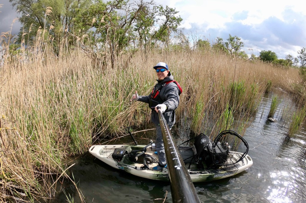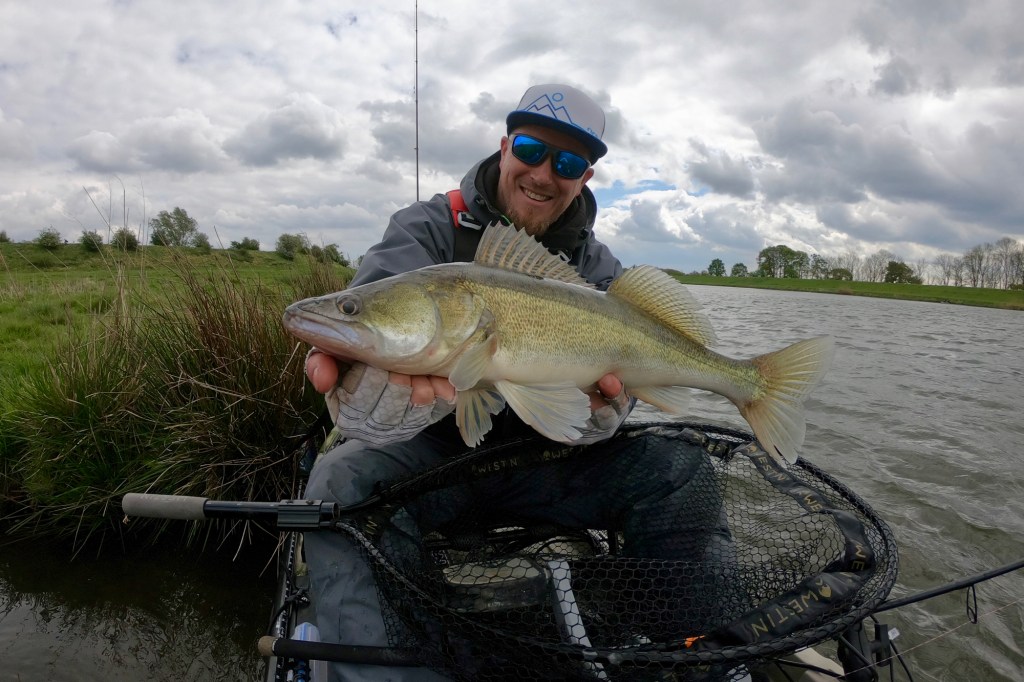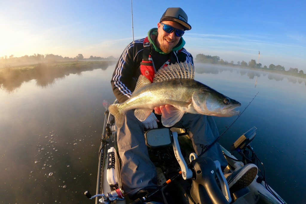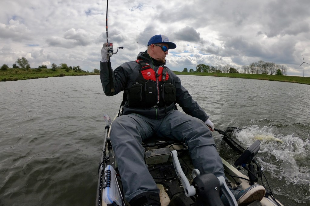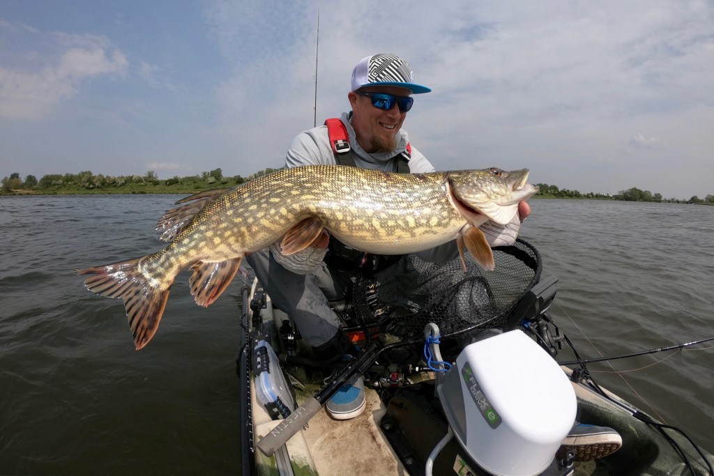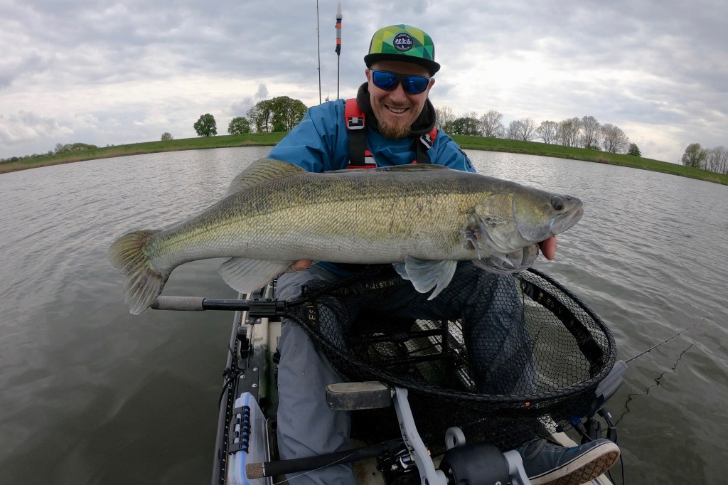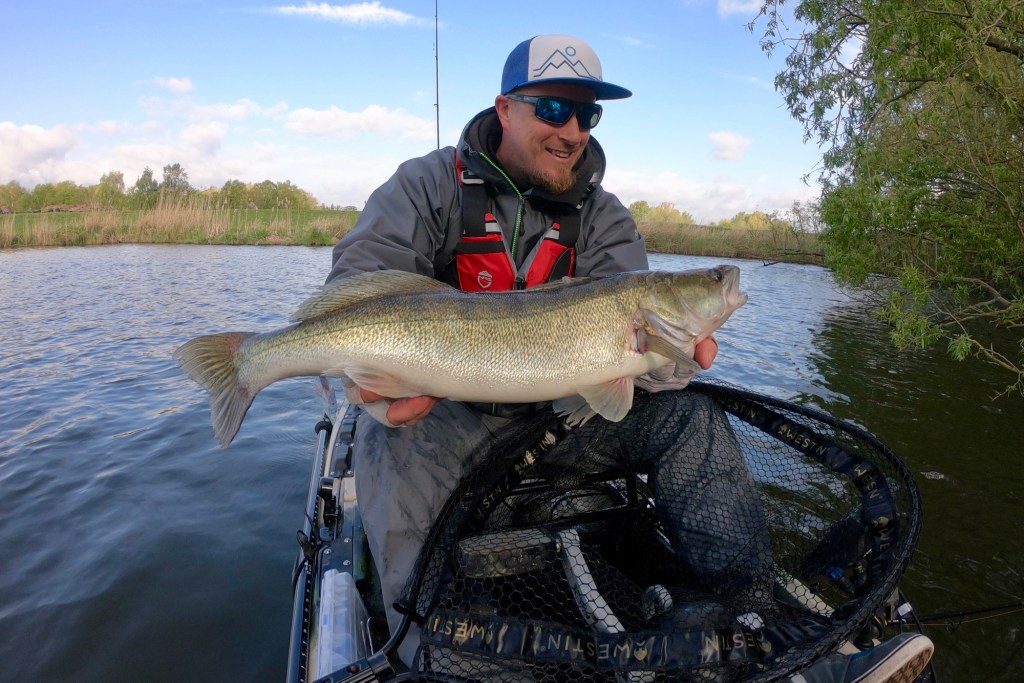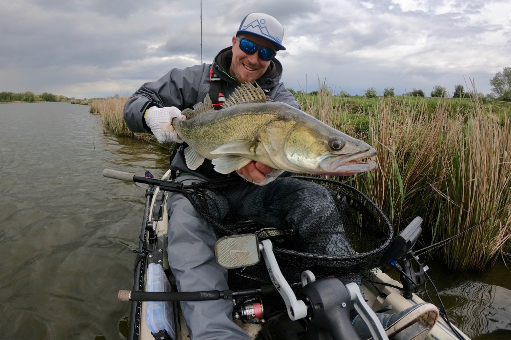 Two days later I was back on the water, but the weather was completely different. The wind came from the opposite direction and was very weak, the clouds were mostly gone and the sun was shining. Not perfect for fishing for pike. But giving up before trying for a long time is not an option. I was right, the cards were completely mixed due to the new weather conditions and the fish were not as aggressive as two days ago. A couple of very careful bites gave some hope that a bite window will open soon and maybe a nice fish will land in my net. Time was running and the sun was slowly setting when a big zander was finally on my kayak for a short photo shoot.